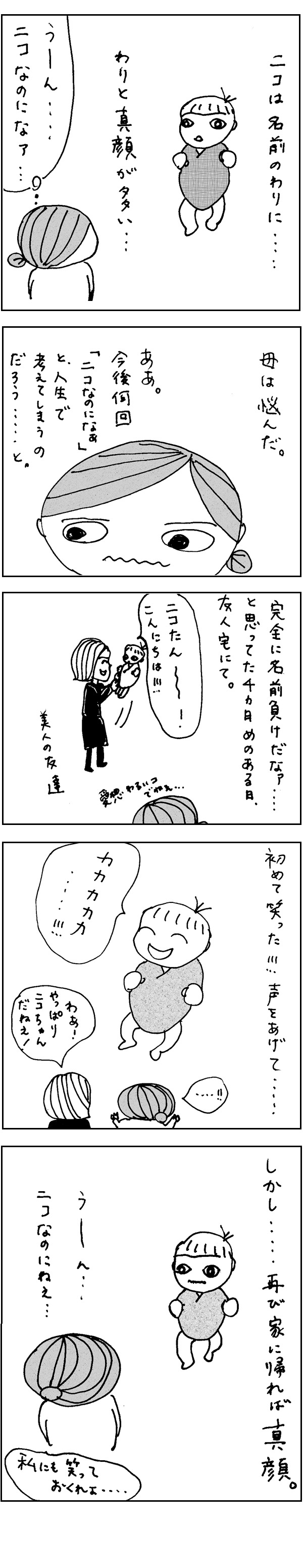 (16)声をあげて笑う? 〜ニコニコしない新生児に悩んでます〜なかなか、笑ってくれないんですよねー。新生児。我が子はうっかりニコという名前をつけてしまったので、なかなか名前負けです。ところが、母と一緒じゃないときにはニコニコ笑ったりして。なぜだ!まとめ頼むから笑ってくれーこの記事に関連するリンクはこちらfacebookのにこたまコミュニティです。ぜひご参加ください。にこたまの公式HPです▼前の記事へ【育児マンガ】はたらく母さんの日々。『にこたま』|バックナンバー ・掲載内容や連絡先等は、現在と異なる場合があります。・表示価格は、改正前の消費税率で掲載されている場合があります。ご了承ください。 関連記事 【育児マンガ】はたらく母さんの日々。『にこたま』|(19)背中センサー みっきーあらなわ 【育児マンガ】はたらく母さんの日々。『にこたま』(23)温かいごはんが、食べたい みっきーあらなわ 【育児マンガ】はたらく母さんの日々。『にこたま』|(7)乳マシーン みっきーあらなわ 関連するキーワード 声 子どもの名前 赤ちゃん 母 はたらく母さんの日々。『にこたま』 あるある 新生児