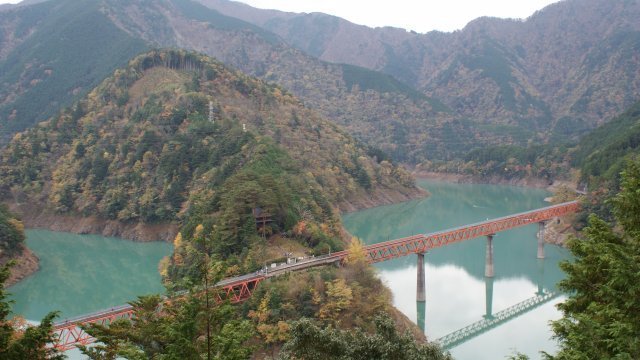 出典:www.okuooi.gr.jp深い渓谷をせき止めた長島ダム付近の接岨峡エリアと呼ばれる一帯。そこに走る「関の沢鉄道」が通る鉄橋付近がおすすめの紅葉スポットです。