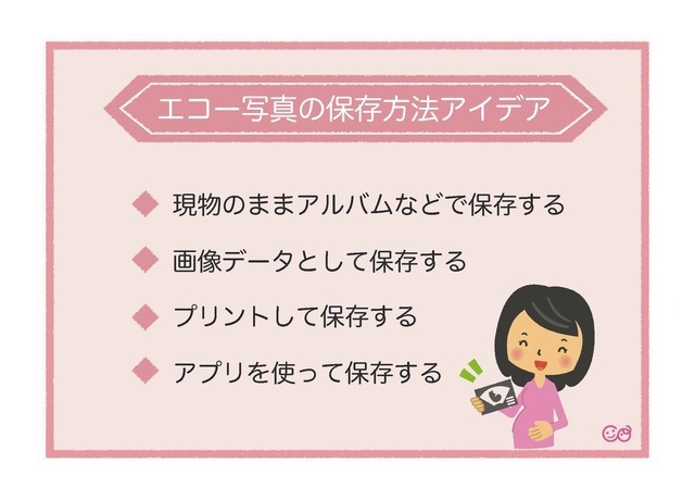 エコー写真は、妊娠中の大切な記録の一つ。保存する際は、その時のママや赤ちゃん、そしてパパの様子などをコメントで残しておくと、数年後お子さんと思い出を共有できますね。
