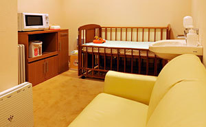 授乳室には、ベビーベッド、おむつ用ゴミ箱、哺乳瓶消毒用電子レンジ、おしり拭き、ポット、消臭剤、空気清浄機が完備しています。