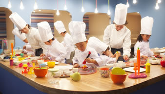 またキッズスタジオでは、子ども用のコックコートに身を包んで本格料理体験もできるんです。