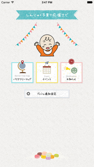 このアプリはいたってシンプルです。機能は、「バリアフリーマップ」「イベント」「お知らせ」の3つだけ。子育て中はなにかと忙しいママパパにとって、使い方が簡単なのが一番です。