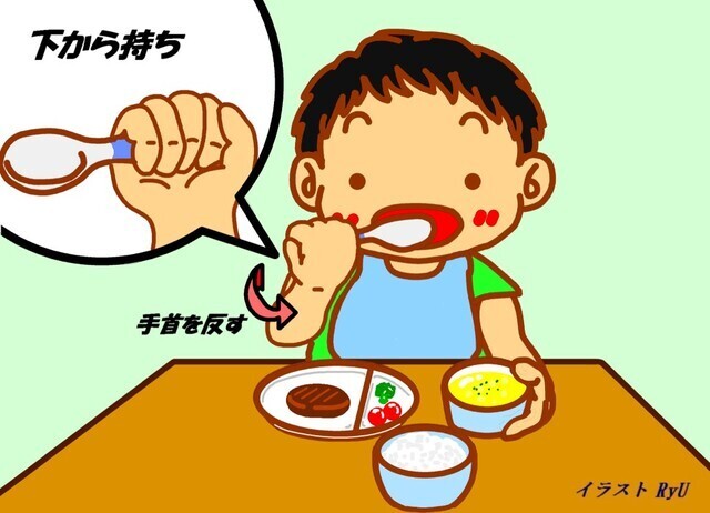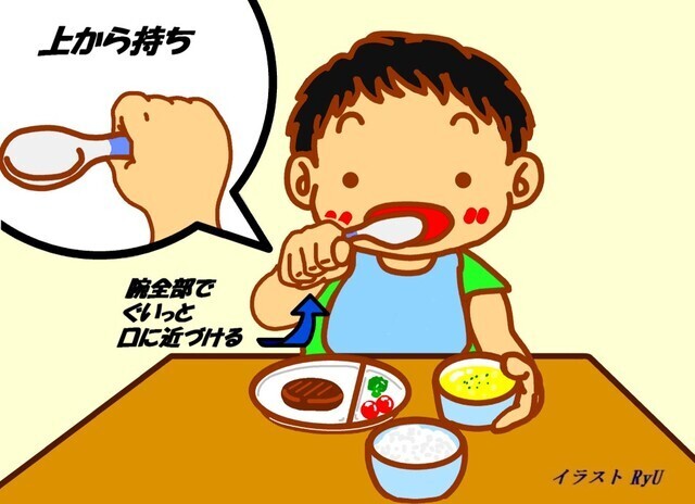 この頃の握り方はスプーンの柄を上からわしづかみする形になります。これは指先の動きの分化が未熟だったり、指先の力が足りず、手を上向きに返す動作もまだ自然ではないために、自然な形としてこの持ち方をするのです。