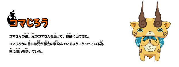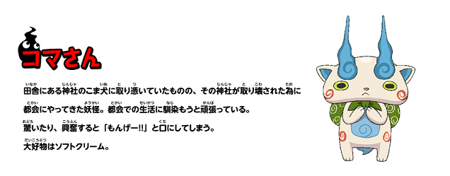 出典:www.tv-tokyo.co.jpジバニャンと人気を二分しているといっても過言ではないのが、狛犬の妖怪、コマさんです。