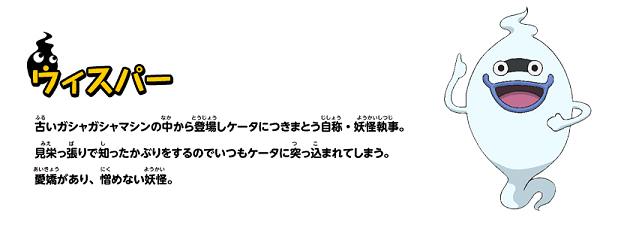 出典:www.tv-tokyo.co.jp妖怪ウォッチで忘れてはならないのがこの妖怪!ウィスパーです。主人公ケータくんが回した古いガシャガシャから突然現れたのが、このウィスパー。