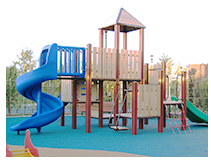 「まちゆい」の施設には、写真のような木のぬくもりが溢れるすべり台があります。靴をぬいで、裸足になって子どもが楽しく遊ぶことができます。