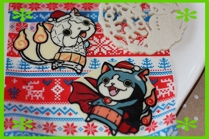 冷えて固まったら、ピンセットなどでジバニャン・フユニャンの顔やパーツを乗せ、サンタ帽のピックを載せれば出来上がりです。