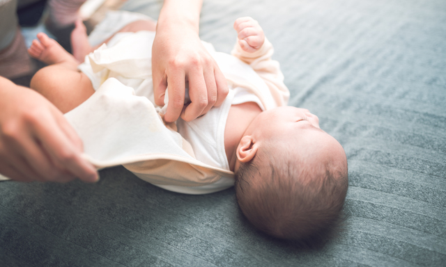 生後3ヶ月ごろになってくると、手足を活発に動かし始める赤ちゃんも増えてきます。短肌着や長肌着だと紐がほどけたり、はだけたりするようなら股の部分をスナップボタンで留められるコンビ肌着やボディ肌着に替えても良いでしょう。