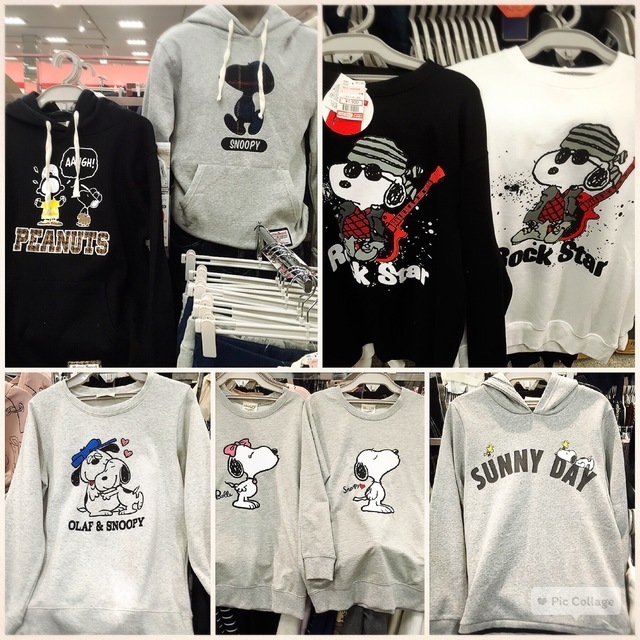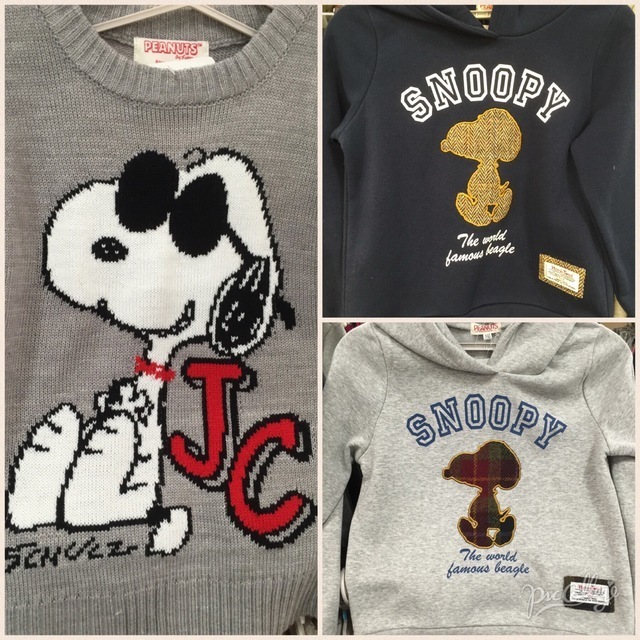 スヌーピー柄のニット(写真左側)は1500円、この大人用が欲しいくらいかわいい...