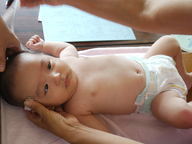 健診では、まず 赤ちゃんの身体測定(体重・身長・頭囲・胸囲)を行い、出生時と比べて発育が順調かを確認します。さらに医師が 全身の診察 を行い、皮膚・おへそ・股関節・腹部などを丁寧にチェックします。