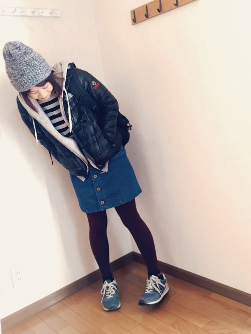 足元は、タイツとソックス、スニーカーでスポーティーに。タイツの色を変えると印象が変わるので、着こなしのバリエーションが増やせますよ。寒い日には、ショートムートンブーツとも相性がよさそうです。