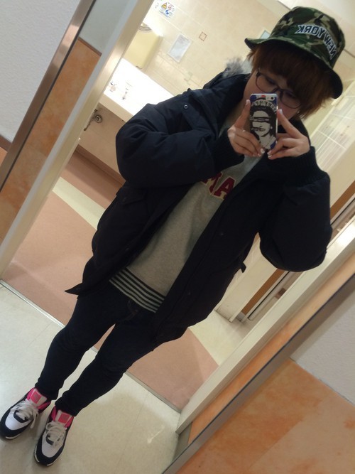 スウェットの下からボーダーシャツを出しているのが、おしゃれさんですね。帽子もこのスタイルに定番のニット帽でなくてハットを持ってきたところがカッコいいです。