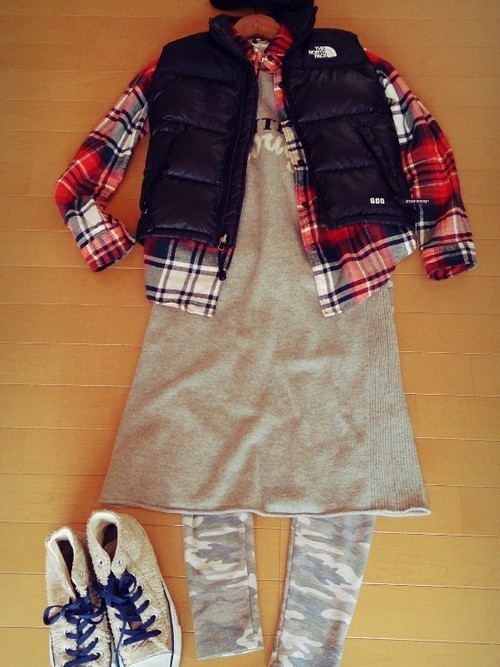出典:wear.jpダウンベストにネルシャツ、ニットワンピースであったかコーデです。スニーカーまでフリース素材でモコモコしてかわいいですね。重ね着上手なママは、とってもおしゃれに見えますよね。