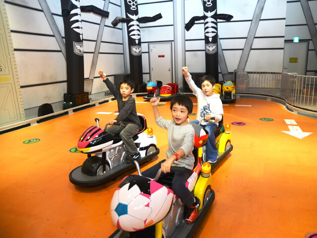 中でも「出発進行!レッドレッシャー(列車のアトラクション)」や「ショッカーアタッカー (サイドカー付ミニカーのアトラクション)」では、1人で座る事ができる3歳未満の子どもから楽しめます。