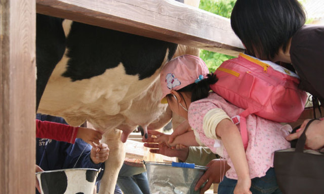 牧場内では毎日11:30分と14:30分の2回、乳しぼり体験を行っています。スタッフの方が子どもたちにしぼり方を優しく教えてくれるので初めてでも大丈夫。