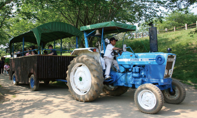 ゆうぎ施設もいろいろ用意されています。トロッコ列車やトラクターワゴンではのんびり牧場の景色を楽しめます。