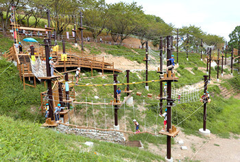 「天狗道場」は身長100センチ以上で高い所が大好きという子どもにはぴったり!専用のハーネスを着用して、まさに天狗になったかのように空中移動を楽しめます。小学2年生以下は、初級コースのみチャレンジできます。