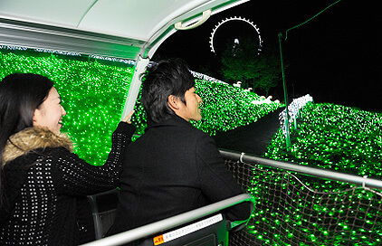 園内を歩いてイルミネーションを楽しむのはもちろんのこと、観覧車、カート、リフトなどのアトラクションに乗りながらもイルミネーションを楽しむことができますよ。
