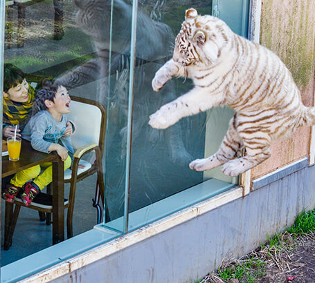 「レストランアニマルキングダム」では、なんと食事をしながらホワイトタイガーやライオンなどの猛獣を見ることができるんです!