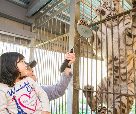 ホワイトタイガーへの餌やりやサイとのふれあいも!