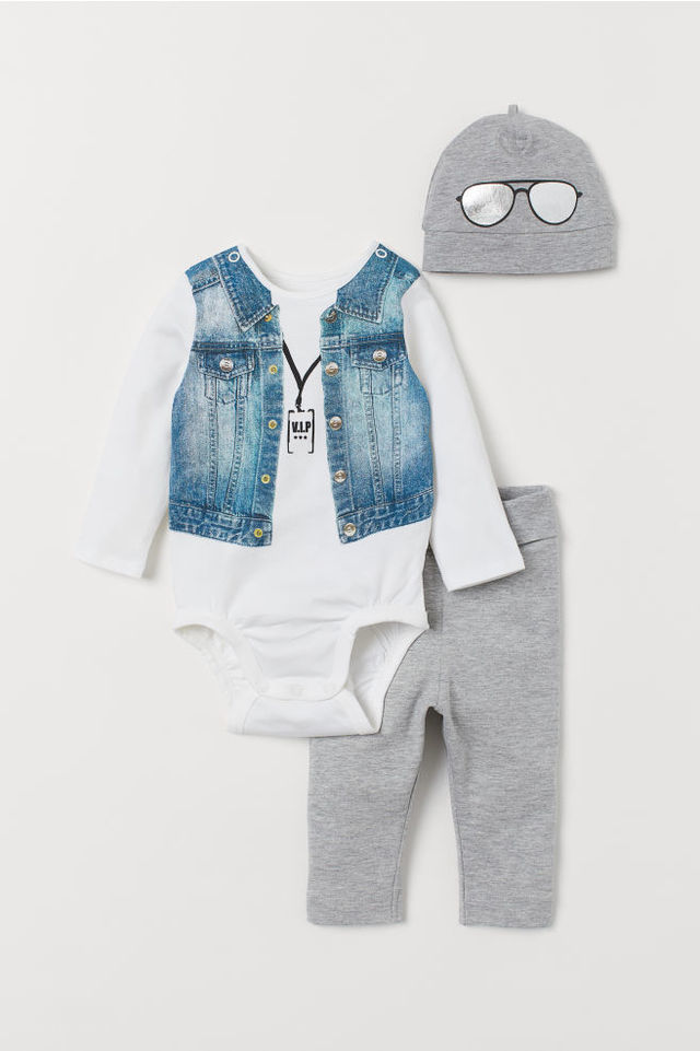 出典:www2.hm.comプチプラで大人気のH&Mは、ベビーウェアも充実しています。こちらはオーガニックコットンを使用した、やわらかいジャージー素材のボディスーツとパンツとキャップの3点セットです。