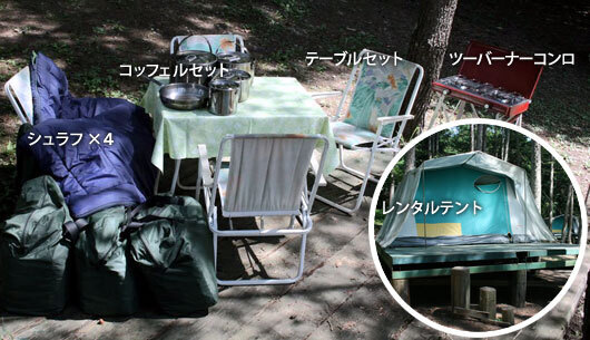 またテント、シュラフ、ツーバーナコンロ、フライパン、テーブルセット(9,000円)もあります。ランタンやシュラフ、タープ、バーベキューコンロセットといったレンタル品も個別でレンタルが可能なのもうれしいポイント。