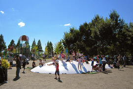 出典:www.pikaru.co.jpこちらの広場にはローラー滑り台のついた仕掛けがいっぱいの大型複合遊具やトランポリンのようなフワフワドームがあり子どもたちに大人気です。ローラー滑り台は、緩やかな傾斜で、小さい子どもでも安心して滑れますよ。