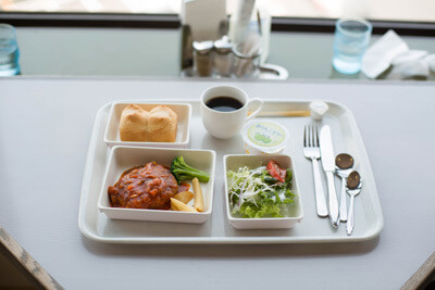サラダ、メインのハンバーグ、パンまたはライス、ドリンクとデザートがそれぞれトレーの上に載せられ、機内食のような盛り付けで提供されるのでちょっとした旅行気分も味わえますね。