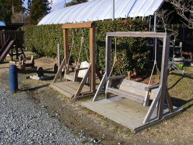 また、炊事場の横には小さいお子さんでも安全に遊べるオーナーお手製の遊具がいくつか設置されています。木の温かみを感じられるベンチ式のブランコ、シーソー、滑り台などで子どもも退屈しませんよ。