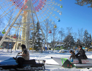 他にも、大興奮の「スノーラフティング」もおすすめです。スノーモービルで引っ張るボートに乗れば、気分爽快ですよ。