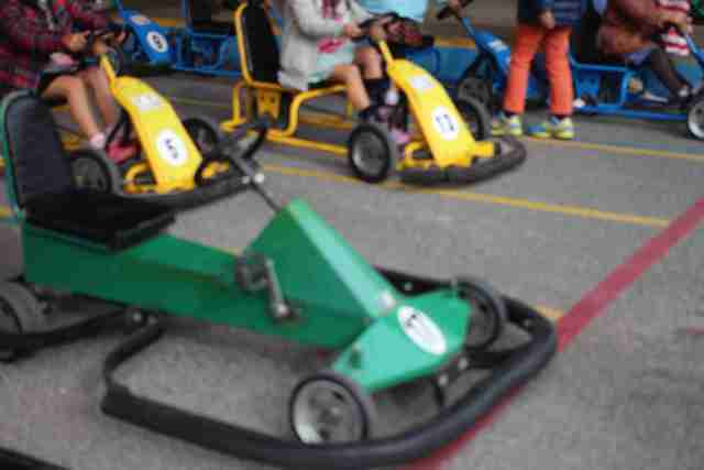 黄色のゴーカートは4歳~小学校1年生程度で120cm以下の子ども用。緑色のゴーカートは小学校2年生程度から大人まで乗ることができます。
