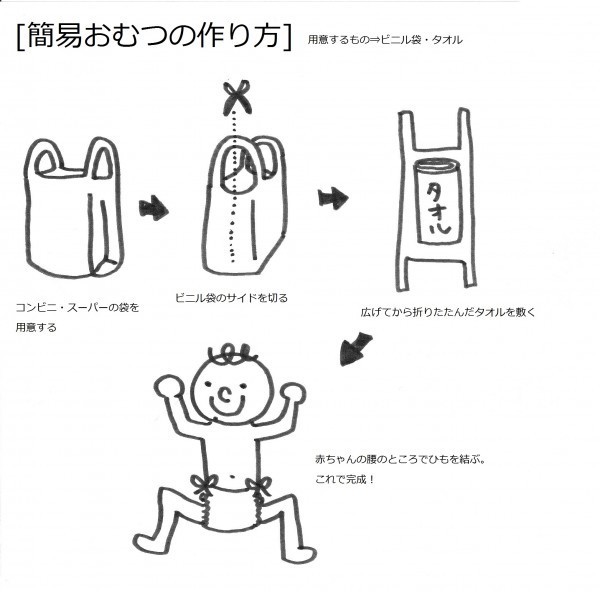 「必要だけど無い!」という災害時に知っていれば役立つ、簡易オムツの作り方をご紹介します。