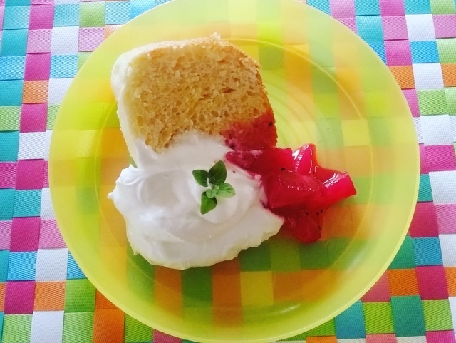 (6)炊飯器のシフォンケーキが焼きあがったら、お皿にひっくり返して食べやすい大きさに切り、ホイップクリームを乗せたら、簡単シフォンケーキの出来上がり!