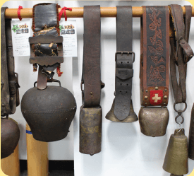 ホルンやカウベルは、牛を飼育する上で必要な道具であり、これらの音色により牛は迷わず誘導する方向へ進んだり、呼び寄せたりすることができる貴重な品の展示も興味深いですね。