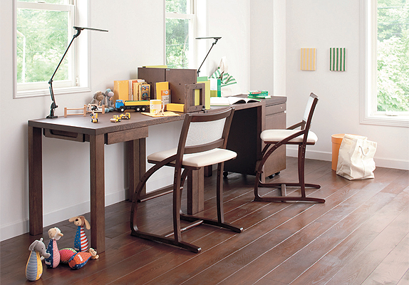 例えば、ダーク系の床に合わせたダーク系の素材を使えば、統一感が出ますね。カリモク家具のダークブラウンのデスクはいかがですか。