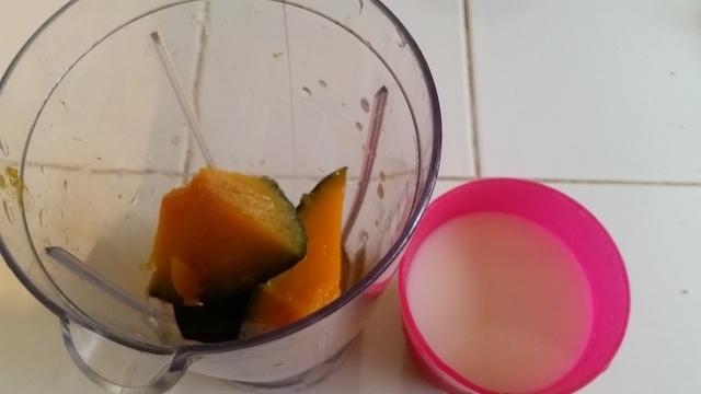 1.(1)で作ったカボチャの煮物を半分、ミキサーに移します