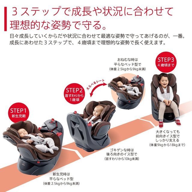 隣に座るパパママといつでも顔を合わせることができるのもうれしいですね。お子さんが1歳になったら、前向きにしてリクライニングとヘッドレストを調節することで、4歳前後まで長く使えるようになっています。