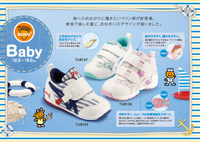 出典:www.asics.comランニングシューズを中心に有名なアシックスからは、ベビーシューズ「スクスク」シリーズが発売されています。