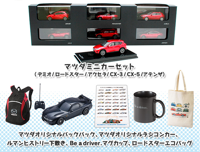 マツダのミニカーセットや、ラジコンカーなど計6点に及ぶ賞品をゲットするチャンスです!