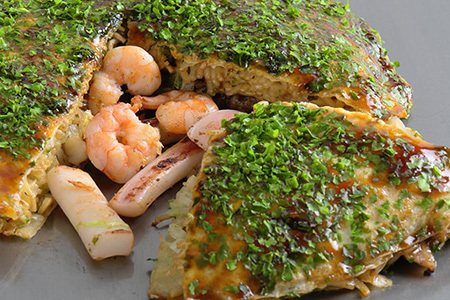 1番人気は生エビと生イカがたっぷり入ったスペシャル。薄めの味に仕上げてあるのでテーブルに置かれているソースで自分好みに調整しながら頬張りましょう。