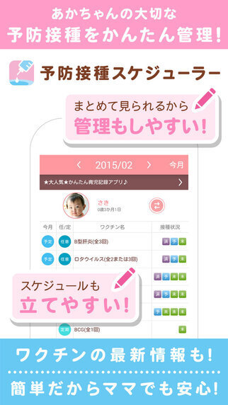 出典:itunes.apple.com生後2ヶ月から始めたい予防接種ですが、気づいたときにはうっかり接種時期を過ぎていたなんてことにならないよう、煩雑な予防接種のスケジュール管理を簡単にできるアプリをご紹介します。