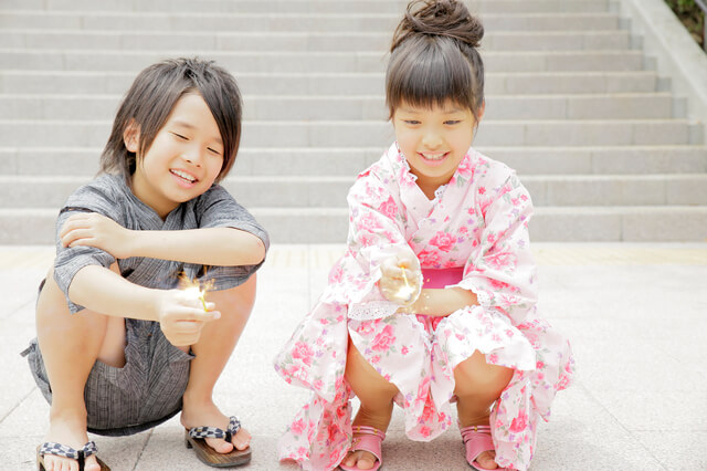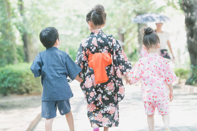 裾が長いので足元が動きにくいのですが、子どもに着せる場合には動きやすいように裾を短めに着せてあげるといいでしょう。甚平とは違い、見た目がお兄さんお姉さんらしくなるので、浴衣も素敵ですね。