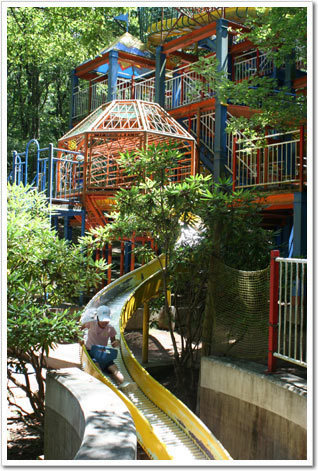 全長約100メートルのローラー滑り台をはじめ、大きなジャングルジム「天の家」、地下のもぐった「地の家」など、子どもが思いっきり遊べる大きな遊具があります。