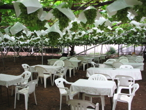 園内ではぶどう棚の真下にたくさんのテーブル席が設置されています。ここに座ってゆっくりとぶどうを食べたり、ぶどうを眺めながらピクニック感覚でお弁当を食べて休憩したり、長い時間楽しめますね。