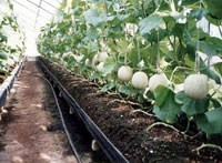 約350坪、8棟のガラス温室の中で時期をずらしながら育てているため、一年中メロンの収穫が可能になっています。