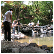 渓流体験ゾーンでは自然の渓流でニジマス釣りができるほか、その場で塩焼きにした魚を500円で食べられるサービスも。釣竿の無料貸出し(餌つき)もあるので、遊園地で遊び疲れたら釣りや足湯の癒しスポットでのんびりするのもおすすめです。