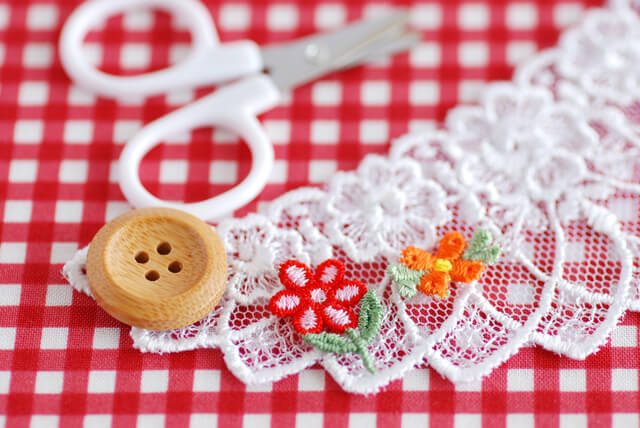 アイデア次第で様々な楽しみ方ができるレースです。モチーフが大き目なので縫いつけてももちろんよいですが、裁縫用接着ボンドでも付けやすくなっています。接着ボンドならお子さんにもできそうですね。