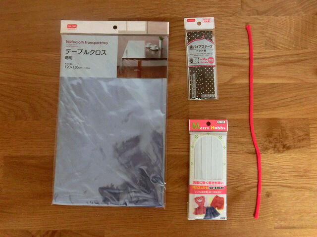 ラミネート加工された生地にお好みの柄がない場合は、100均のテーブルクロスやランチョンマット、ビニール素材の市販の袋、不要になった子ども用の傘などを使って作るのもいいでしょう。