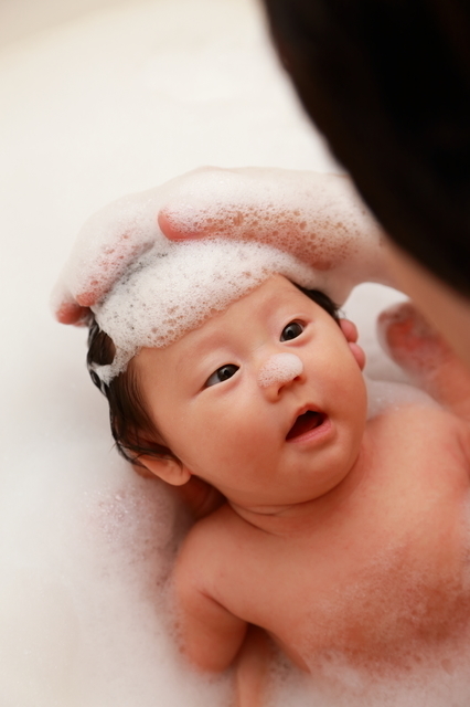 また、洗い場に赤ちゃんを寝かせる場合は、ママが使う石鹸の泡が目に入らないように注意します。