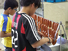 手作り体験では、実際に自分たちで肉の骨を外すことから始まります。その後、肉はミンチされ、香辛料などを加えて様々な工程を経ていきますが、ミンチ肉を羊腸につめることから、ねじることまでも自分たちで行います。